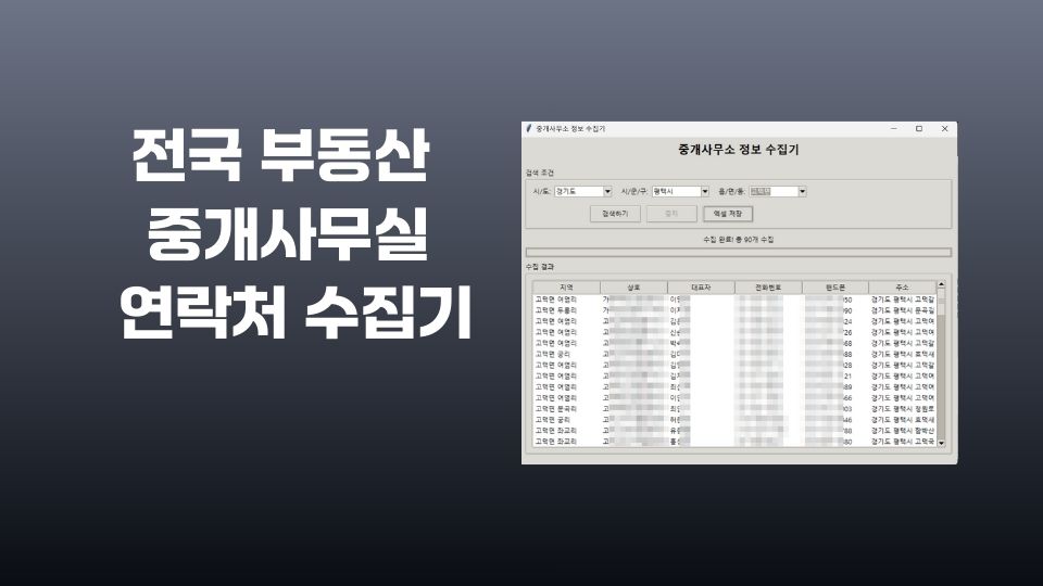 전국 공인중개사 사무소 수집기는 한국공인중개사 웹사이트에서 전국 부동산 중개사무소의 상세 정보를 자동으로 수집하여 엑셀 파일로 저장해주는 Python 기반 데이터 수집 프로그램입니다.